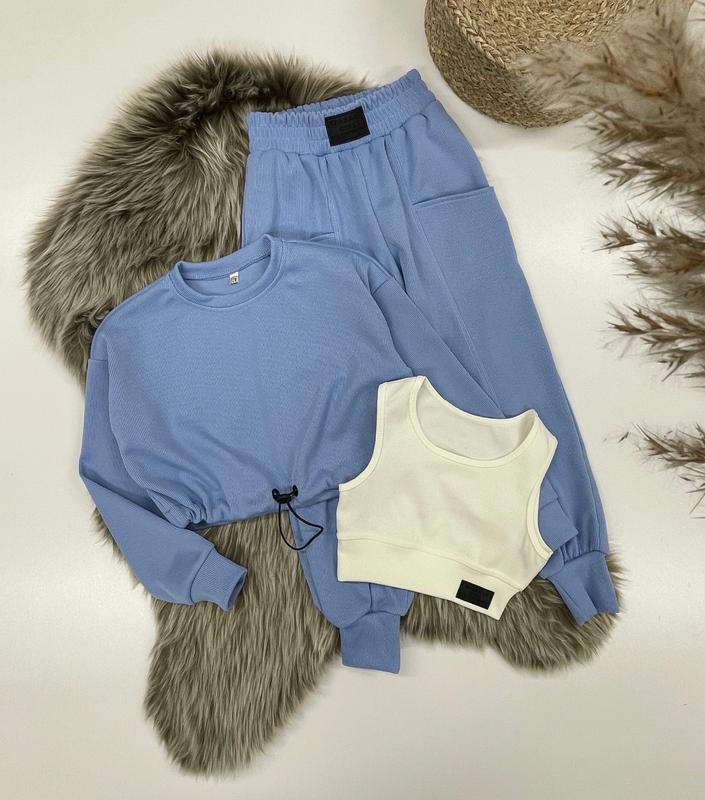 арт 4472 НОВИНКА! Комплект 3 в 1 кофта, топ та штани тканина рубчик кофта з утяжкою понизу топ з нашивкою штани в поясі під резинку з кишенями РЕКОМЕНДУЮ! зріст/довж.кофти/пог/рукав від горловини/довж.топа/пог/довж.штанів/крок/пот/поб похибка+-2см 128/32/43/54/26/28/73/52/24/40-1шт 134/33/44/56/27/29/77/55/25/42-1шт 140/35/46/58/28/31/81/58/26/44-1шт