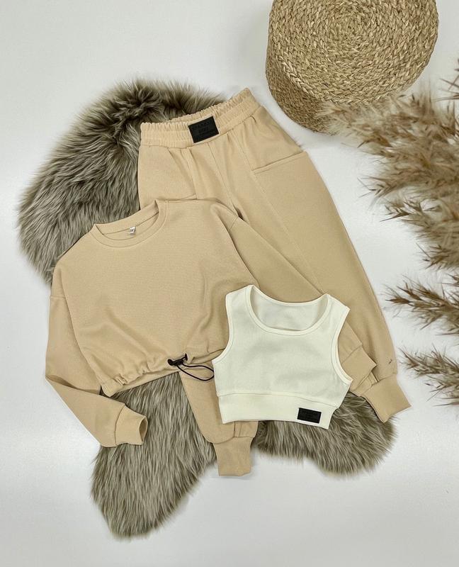 Таня арт 4473 НОВИНКА! Комплект 3 в 1 кофта, топ та штани тканина рубчик кофта з утяжкою понизу топ з нашивкою штани в поясі під резинку з кишенями РЕКОМЕНДУЮ! зріст/довж.кофти/пог/рукав від горловини/довж.топа/пог/довж.штанів/крок/пот/поб похибка+-2см 128/32/43/54/26/28/73/52/24/40-1шт 140/35/46/58/28/31/81/58/26/44-1шт 146/36/47/61/29/32/85/61/27/45-1шт 152/38/49/64/30/34/88/63/28/46-1шт