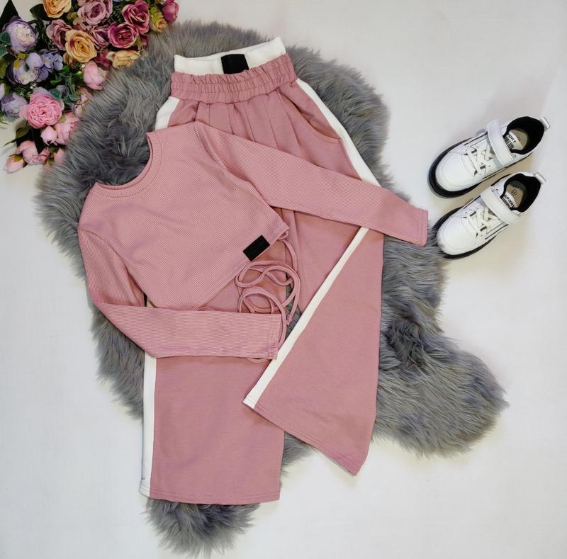 ток в наявності 👍👍 Гарний костюм для дівчинки Штани палаццо двонитка з високою талією Дуже стильно виглядає Топ мустанг рубчик, на зав’язках Якість чудова! Довжина кофтинки/Пог/рукав/довжина штанів з білою резинкою/крок/резинка 128-29/31/47/84/58/24 134-31/32/49/88/60/26 140-32/33/51/91/63/27 146-34/34/53/93/66/27 152-35/36/55/98/68/28