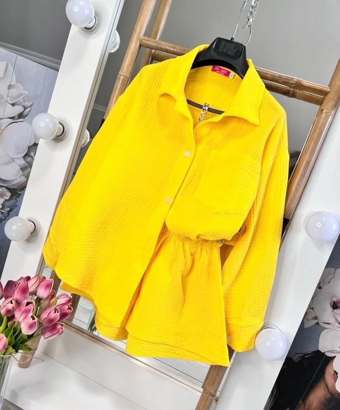 Арт 4897 Ніжний та яскравий літній відтінок Костюм в якому буде комфортно і не спекотно Сорочка та шорти Сорочка на ґудзиках Шорти під резинку Тканина муслін Рекомендую Зріст/довж.сорочки/пог/рукав від горловини/довж.шорт/пот похибка+-2см 152/62/47/65/32/28-1шт 164/67/51/70/36/30-1ш Тан