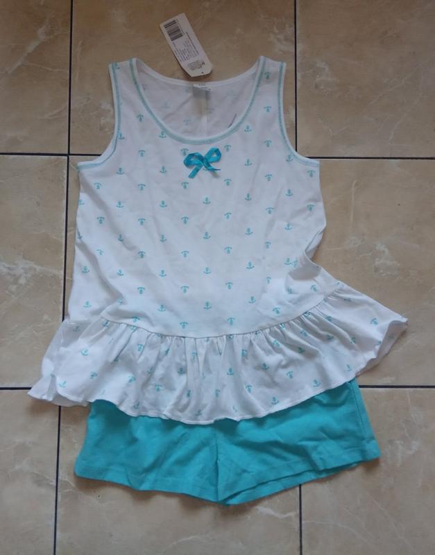 Дитячий сет майка з рюшею + короткі шорти з кишенями, розмір 122 на 6-7 років, 100% бавовна. Дуже красивий відтінок блакитного з бірюзовим підтоном, модний принт міні-якір. Заміри у вільно-лежачому положенні, без натяжки: майка - напівобхват грудей 35 см, довжина по центру спинки 46 см (в т.ч. рюша 10 см), шорти - напівобхват талії по резинці 24-25 /тягнеться до 37 см/, стегон 37 см, внутрішній кроковий шов 3,5 см, боковий шов 23 см. Український виробник ПрАТ ТФ "Роза"