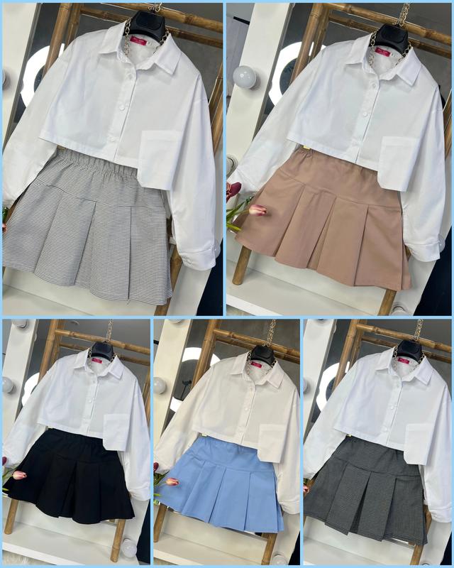 Костюмчик який заполонив ваше серце 💓 Стильний, модний, стане улюбленим у вашому гардеробі , Тканина коттон Рубашка на ґудзиках, крутезна спідничка плісеровна, талія на резиночці, дуже гарно сідає по фігурі! Рекомендуємо ! Ціна 990 грн Заміри від горловини Довжина/рукав/пог/довжина/пояс 140-36/60/43/36/27 146-37/62/44/37/28 152-38/65/46/38/29 158-39/68/48/39/29 164-40/71/49/40/30 +-2см