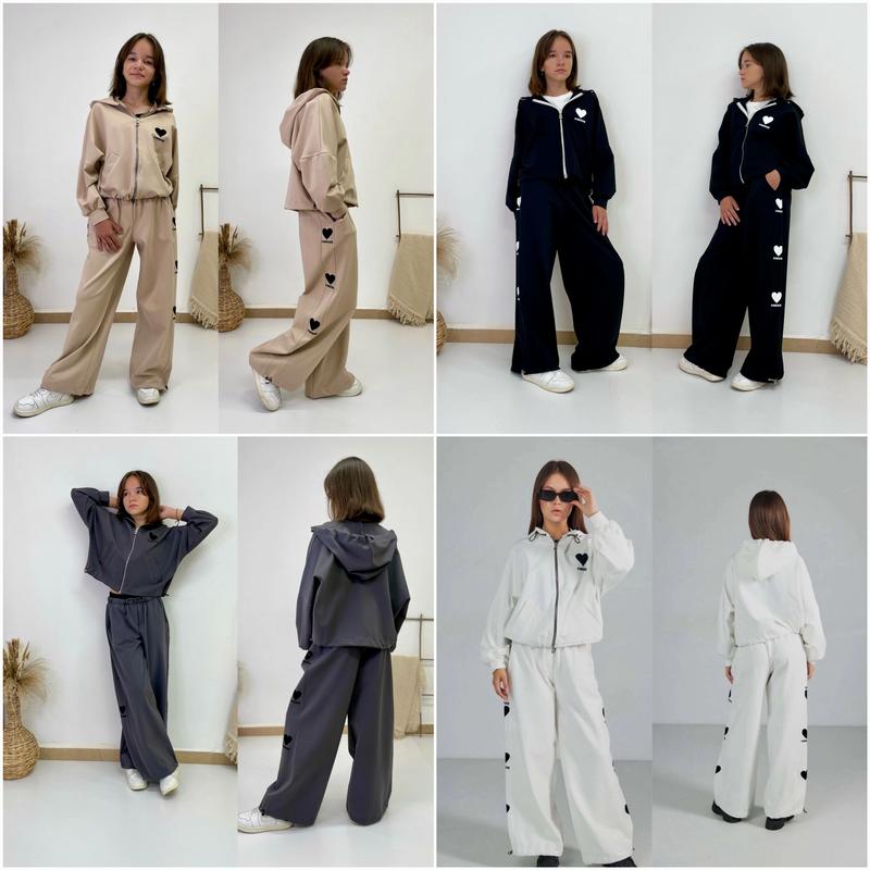 💝Костюм з широким худі на блискавці, спущений рукав та брюки вільного крою на стяжках, оздоблено замшевими сердечками 🏷Розміри: 140-164 🪡Тканина: трикотаж "Алекс", чудова якість! 📐Заміри: зріст/довж.худі/ширина понизу/рукав від горловини/довж.штанів/крок/пот/поб похибка+-2см 140-146/46/48/58/88/62/25/49 146-152/48/50/60/91/65/26/51 152-158/50/52/63/95/68/27/54 158-164/52/53/65/98/72/28/55 164-170/54/54/68/101/76/30/57.