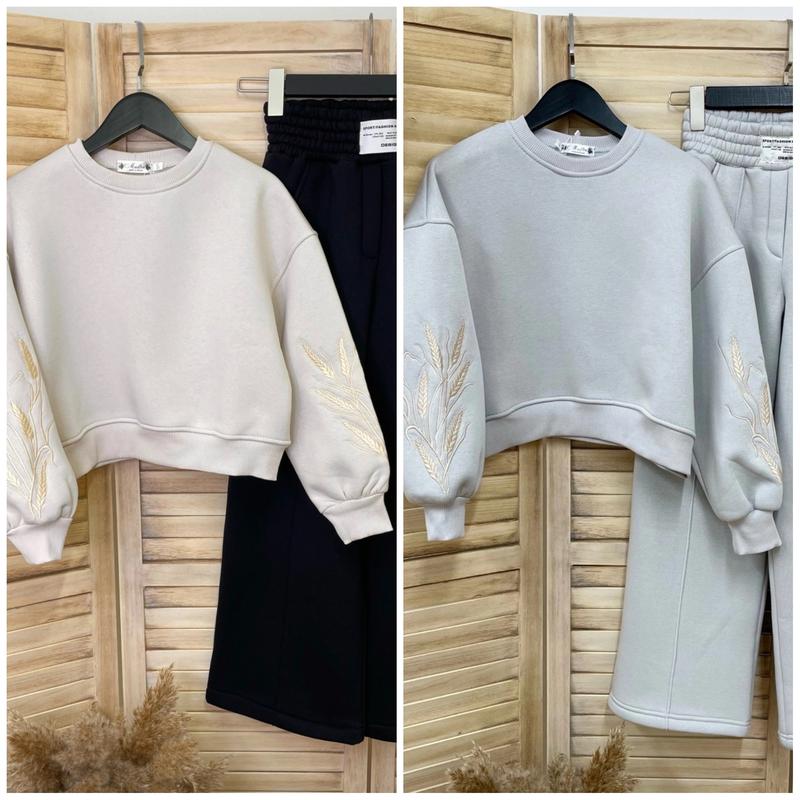Суперський костюм світшот зі справжньою вишивкою манжети рібана штани палаццо-труби з кишенями у поясі під резинку по переду висточка Тканина тринитка пенʼє на флісі (не схильна до появи катишків) СУПЕР ЯКІСТЬ! ір зріст/довж.світшота/пог/рукав від горловини/довж.штанів/крок/пот/поб похибка +-2см 164-170/57/59/72/104/76/31/50-1шт