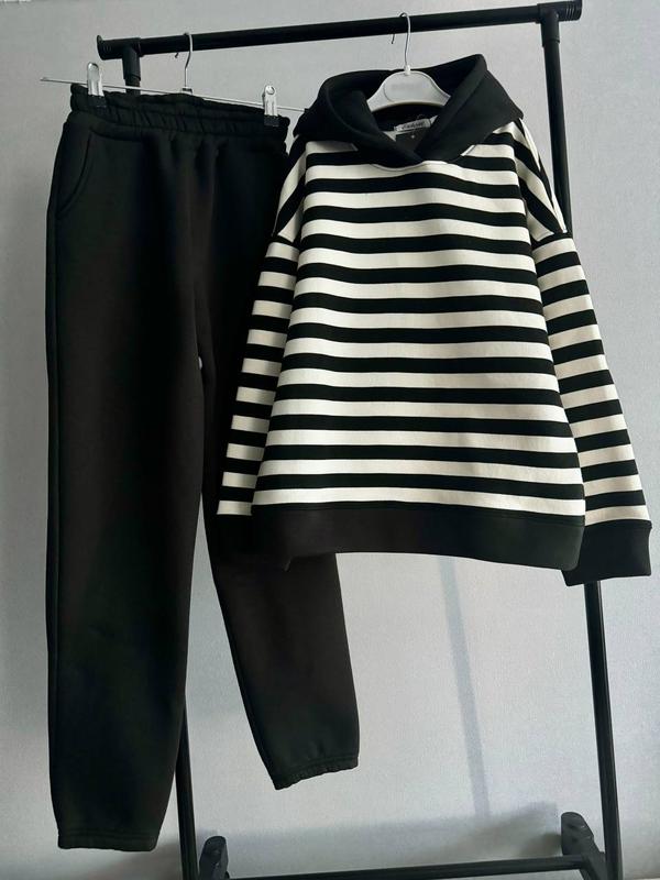 МОДЕЛЬ УНІВЕРСАЛЬНА, ДЛЯ ХЛОПЧИКІВ ТА ДІВЧАТОК 👉ТКАНИНА: ТУРЕЦЬКА ТРИНИТКА НА ФЛІСІ, ЯКІСТЬ ПІНЬЄ 👉 склад тканини: 95% хлопок 5% еластан 👉 НЕ КОШЛАТИТЬСЯ, не скрипить! 👉всі шви відстрочені 👉подвійний капюшон 👉чорно-білий полоска ВИМІРИ: р.146 довж худі/рукав/ширина 56/60/46 довжина штанів/крок/стегно/пояс 89/64/43/28см р.152 довж худі/рукав/ширина 58/62/47 довжина штанів/крок/стегно/пояс 93/67/45/29см р.158 довж худі/рукав/ширина 61/65/48 довжина штанів/крок/стегно/пояс 97/70/46/31см р.164 довж худі/рукав/ширина 68/70/49 довжина штанів/крок/стегно/пояс 101/74/47/32см Довжина рукава вказана від горла