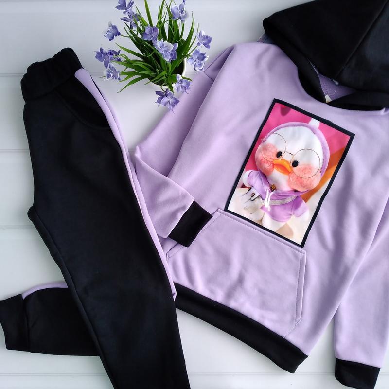 Костюм із зображенням - Качечка Лалафанфан😍😍😍🔥🔥🔥 БВ Тканина: турецька тринитка петля (без начісу!)/ Аплікація пришивна Колір: фіолетовий р.146- Худі: довжина 60см / рукав від горловини! 64см / ОГ 90см. Штани: довжина 90см / крок 68см -1шт є накалдений по передоплаті 160 грн , безпечной сделкой не відправляю!!! Як що посилку не отримуете , передоплата не повертается! Відправка зі склада фабрикі
