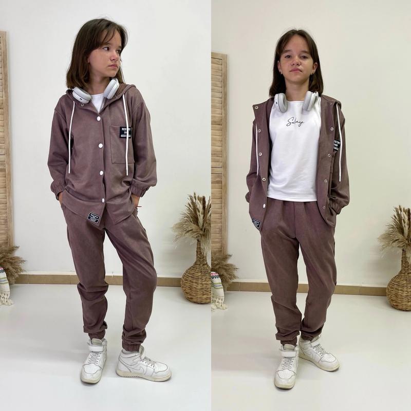 Неймовірно гарний костюм сорочка+футболка+штани з капюшоном на кнопках штани з кишенями під резинку тканина замш-діагональ ( колір кнопок,надписи на футболках та на нашивках можуть бути іншими) РЕКОМЕНДУЮ! зріст/довж.сорочки попереду/пог/рукав від горловини/довж.футболки/пог/довж.штанів/крок/пот/поб похибка +-2см 146/58/47/57/44/37/93/67/26/46-1шт 152/61/48/59/46/39/97/69/27/47-1шт 158/63/49/61/48/40/100/71/28/49-1шт 164/64/50/63/49/42/104/74/30/50-1шт