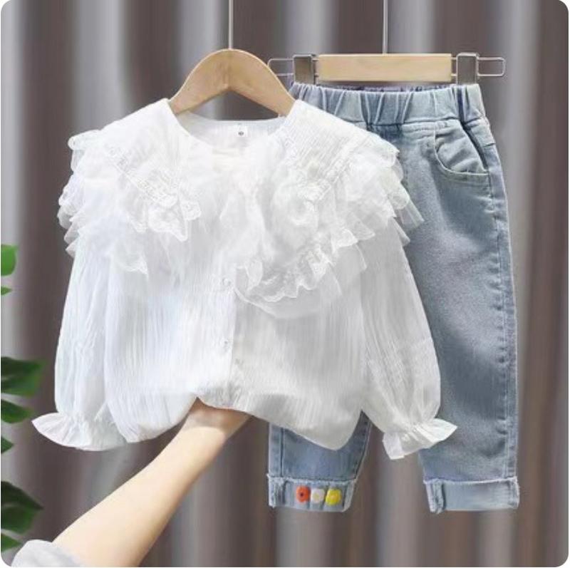 📝 Дуже гарний костюмчик для дівчаток 🖤 Блузка - бавовна 🖤 Застібається на ґудзики 🖤 Зверху два шари об'ємних рюшів 🖤 Рукава на резинці 🖤 Штани - джинс 💯 🖤 Пояс на резинці Розмір 110(1 шт) 120(2 шт) 130(2 шт) 140(2 шт) 110-Довжина блузки 41 см рукав від плеча 38 см ширина 30*2 см Довжина штанів 56 см крок 35 см пояс 19*2 см 120-Довжина блузки 43 см рукав від плеча 40 см ширина 31*2 см Довжина штанів 61 см крок 37 см пояс 19*2 см 130-Довжина блузки 46 см рукав від плеча 42 см ширина 34*2 см Довжина штанів 65 см крок 43 см пояс 19*2 см 140-Довжина блузки 49 см рукав від плеча 44 см ширина 35*2 см Довжина штанів 70 см крок 47 см пояс 19*2 см Виміри зроблені однієї ростовки Допустима похибка +-1-2 см