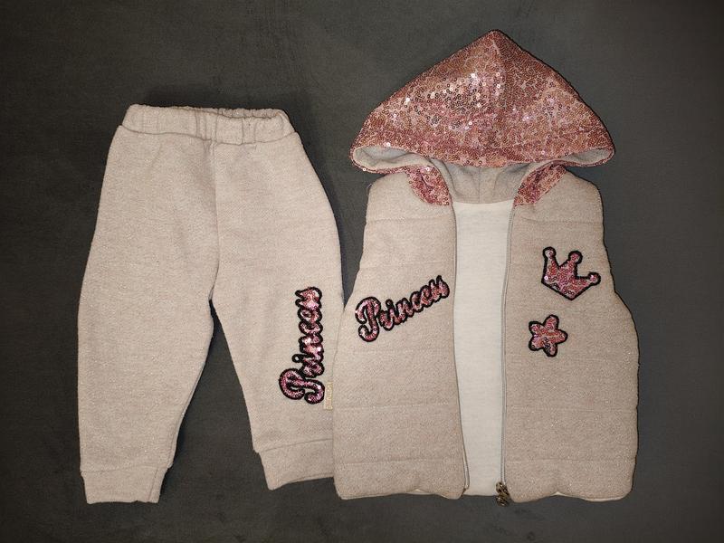 Продам костюм для дівчинки на вік 9-12 місяців. Чудовий стан одягу. Жилетка на м'якій підкладці, штани без підкладки. Заміри видно на фото.