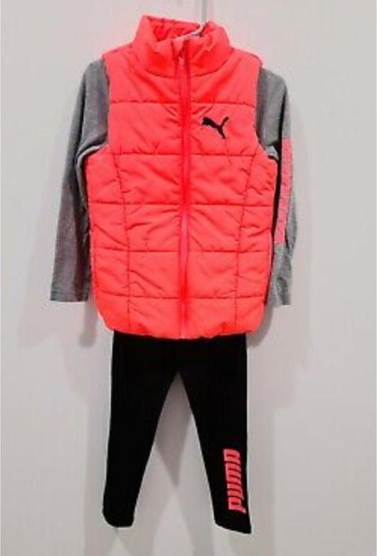 Яскравий PUMA набір на дівчинку із 3 речей лонгслив,лосини, жилетка NEON Orange Size XS 5/6 Фактичні виміри: жилет: пахви 39см; ПОТ 38см; низ 35см; плечі 29см; довжина виробу повністю по спині 48см+ комір 5,5см. лонгслив: пахви 33,5см;ПОТ 34см; низ 36см; плечі 28см; довжина рукава від плеча 44см; довжина виробу повністю по спині 48см; лосини; пояс 25см+ тягнеться до 45см; ПОС 29см+ тягнеться до 60см; довжина виробу повністю по боку 59см; крокова довжина 45см; ширина штанини внизу 8см+ тягнеться до 15см.