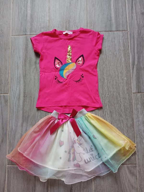 Гарненький літній костюм. В гарному стані. Заміри: Спідниця довжина 23 см/ 28 см з фатіном, пояс гарно тягнеться. Футболка довжина 38 см.