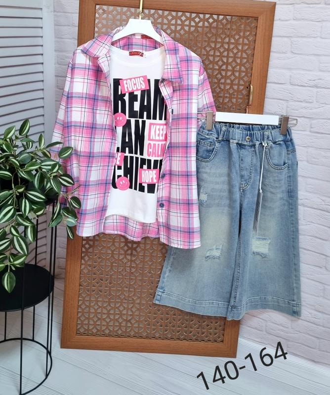 Любі клієнти! ‼️Наложка є тільки новою поштою по передоплаті 150 грн. Укр пошта по повній оплаті. Безпечної оплати немає! Перед замовленням, уточніть наявність! Дякую ❤️ Стильний лук😍 Футболка+сорочка+джинсові бермуди тканина футболки кулір преміум якості тканина сорочки фланель сорочка на ґудзиках ПОВНОМІРНІ OVERSIZE ЯКІСТЬ ЧУДОВА!!! РЕКОМЕНДУЮ!!! 140-146-1 шт 146-152-1 шт 152-158-1 шт 158-164-1 шт 🌿140-146-довжина футболки 56,пог 53,довжина сорочки 62,пог 49,рукав від горловини 62,довж.бермуд 63,крок 37,пояс 25,поб 47 🌿146-152-довжина футболки 58,пог 54,довжина сорочки 64,пог 51,рукав від горловини 64,довж.бермуд 66,крок 38,пояс 25,поб 48 🌿152-158-довжина футболки 60,пог 55,довжина сорочки 66,пог 52,рукав від горловини 66,довж.бермуд 69,крок 42,пояс 26,поб 50 🌿158-164-довжина футболки 61,пог 56,довжина сорочки 67,пог 52,рукав від горловини 68,довж.бермуд 70,крок 43,пояс 26,поб 52 +-2 см ✅Ціна 2075 грн