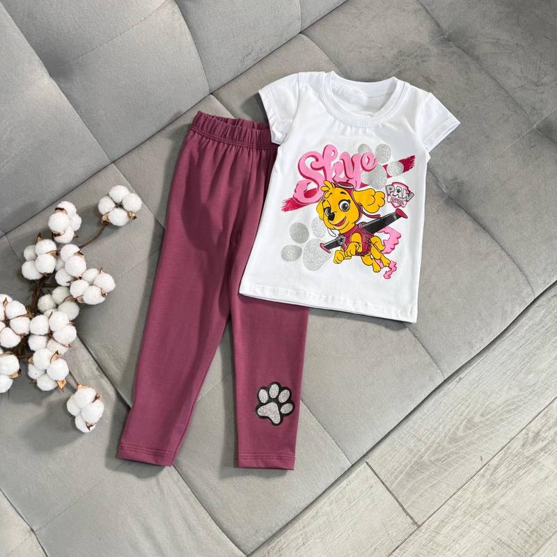 Тканина турецький трикотаж 95% бавовна, 5% еластан. Малюнок- накат. Лосіни з малюнком. Тканина гарно тягнеться. Заміри: (98-104) - футб. довж. 38/ напівобхв 24 / лосіни довж 50 / крок 32 (104-110) - футб. довж. 40/ напівобхв 26 / лосіни довж 58 / крок 39 (110-116) - футб. довж. 44/ напівобхв 28 / лосіни довж 63 / крок 44 (116-122) - футб. довж. 47/ напівобхв 29 / лосіни довж 72 / крок 52