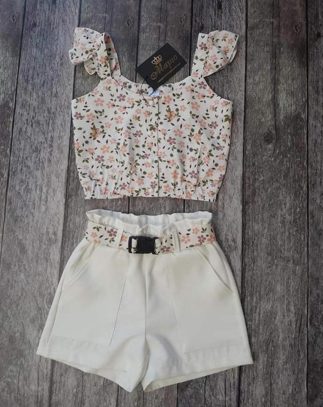 Топ і шорти Топ застібається на гудзики. Тканина: топ - штапель, шорти - костюмна. Заміри: 134 шорти довжина - 30см, пояс - 25см, напівобхват бедер - 40см. топ довжина від плеча - 34см, напівобхват грудей - 35см. 140 шорти довжина - 31см, пояс - 26см, напівобхват бедер - 42см. топ довжина від плеча - 36см, напівобхват грудей - 37см. 146 шорти довжина - 32см, пояс - 27см, напівобхват бедер - 43см. топ довжина від плеча - 39см, напівобхват грудей - 40см. 152 шорти довжина - 33см, пояс - 28см, напівобхват бедер - 45см. топ довжина від плеча - 40см, напівобхват грудей - 41см.