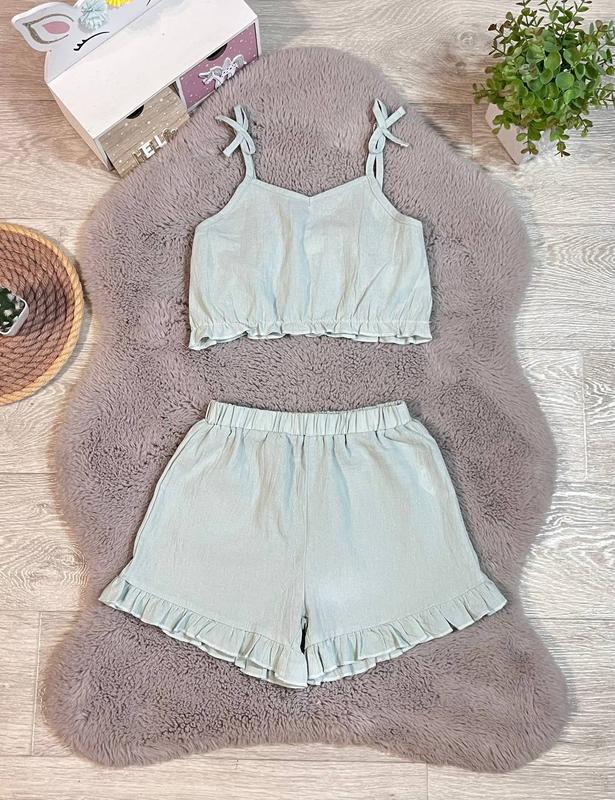 Удобный стильный костюм идеальное состояние в приятном мятном цвете свободная модель отличное качество ткань легкая дышащая приятная к телу по бірці 9р верх дол 29 пог 33 тянется шорты дов 30 крок 8 пот 26 резинка поб 39