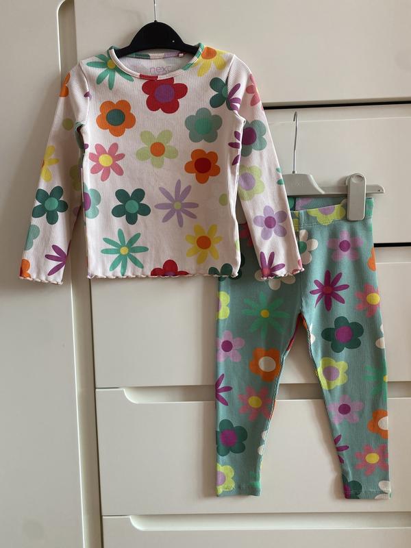 Лонгслів та лосіни для дівчинки від NEXT. Тканина в рубчик. Склад тканини: 95% бавовна, 5% еластан. Розмір у наявності, згідно бірки: 🔸2-3 р. (98) Заміри: Верх ширина під руками (півобхват) - 26,5 довжина рукава від плеча / горловини - 35 / 39,4 довжина спереду від горловини - 35,5 Низ ширина в поясі (півобхват) - 23 довжина по зовнішньому шву - 49 довжина по внутрішньому шву - 34