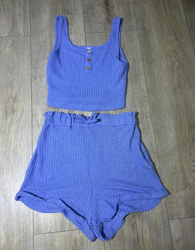 Костюм літній або як піжама вафелька Бірки зрізані на сайті ціна 10євро Довжина топа- 36 см Пів обхват грудей-35 до 57 см тягнеться Довжина шортів - 31 см Пів обхват стегон- 42 до 66 см