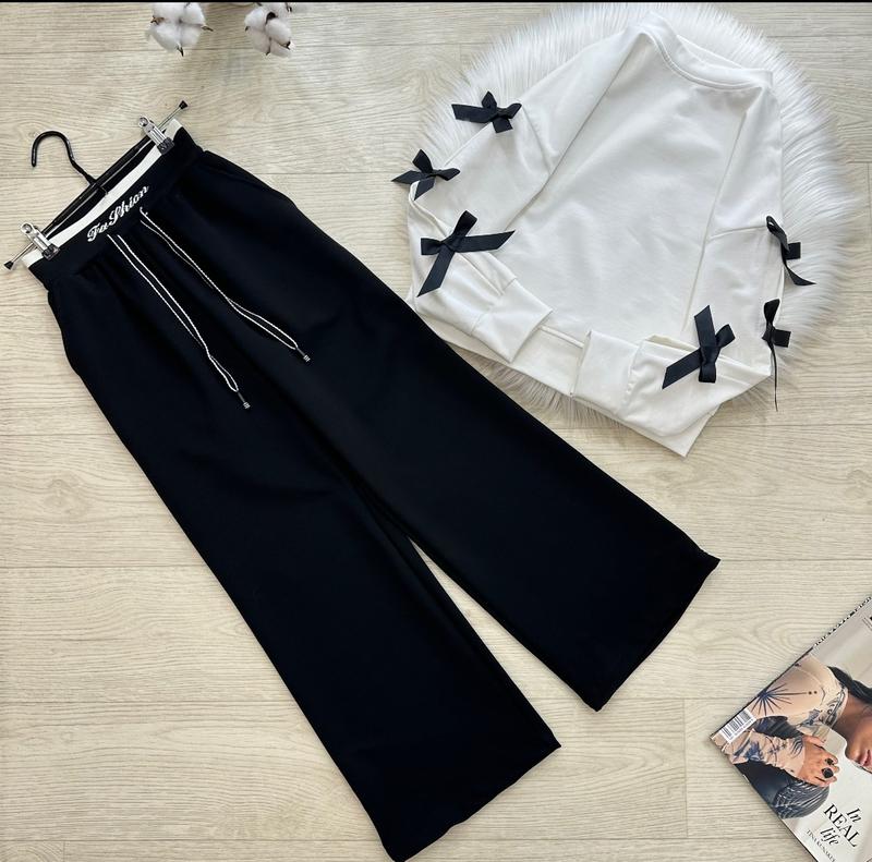 через кнопку купити тільки повна оплата!!! Стильовий костюм з трендовими бантиками 🎀🤩🎀 Світшот вільного крою з розрізними рукавчиками 😍 Контрасні бантики 😎 Штани палаццо з затяжками понизу, що дає можливість носити їх, як широкими, так і завуженими 🤩🤩🤩 Широка стильова резинка ✨ Є кішеньки, діючі куліски 😉 Ну дуже крутий костюмчик 😎 Тканина: турецька двонитка в якості пен'є💖 Виробник: Україна 🇺🇦 ЗАМІРИ ⤵ +/- 1-2см!!! ◾р.134- Світшот: довжина від плеча 49см/ рукав від горловини 58см/ ПОГ 49см. Штани: довжина по бічному шву 89см/ крок 63см/ ширина стегон 39см. ◾р.140- Світшот: довжина від плеча 52см/ рукав від горловини 62см/ ПОГ 50см. Штани: довжина по бічному шву 94см/ крок 65см/ ширина стегон 44см.