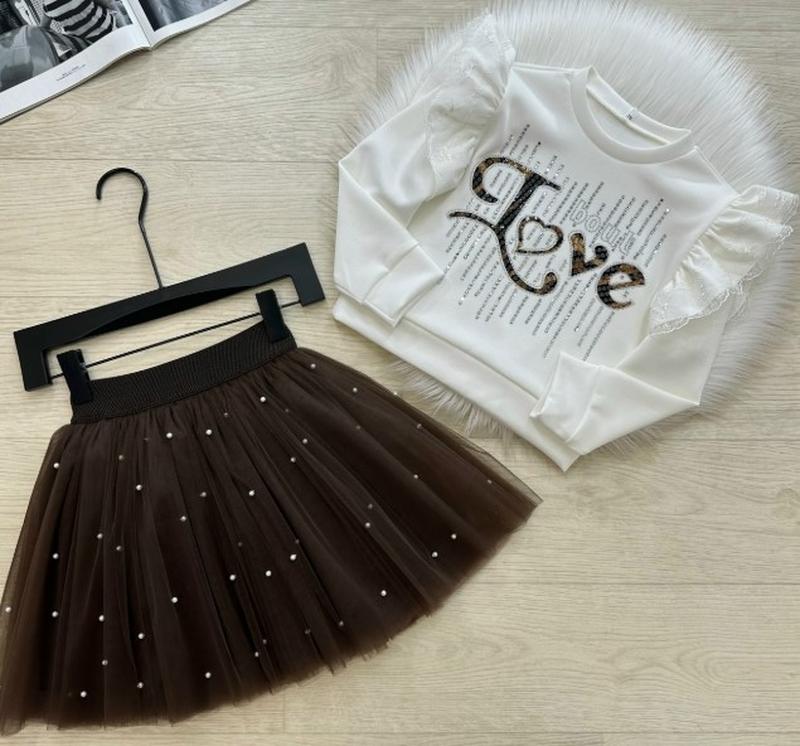 НЕЙМОВІРНО крутий костюмчик з пишною спідничкою у трендовому шоколадному кольорі Світшот із ніжними рюшами та красивим оздобленням — камінці та перлинки додають образу особливого шарму✨ Спідничка дуже пишна, складається з чотирьох шарів євросітки з підкладкою Перлинки на металевій ніжці виглядають просто розкішно 🤍 Тканина: світшот — трикотаж / спідниця — євросітка з підкладкою 🎀 Виробник: Україна 🇺🇦 ЗАМІРИ р.116-Довжина кофтинки від плеча 38см/ рукав від плечового шва 41см/ ПОГ 36см. Довжина спідниці 39см/ ширина пояса 23см (тягнеться до 36см) р.122-Довжина кофтинки від плеча 40см/ рукав від плечового шва 43см/ ПОГ 37см. Довжина спідниці 41см/ ширина пояса 23см (тягнеться до 36см) р.128-Довжина кофтинки від плеча 41см/ рукав від плечового шва 46см/ ПОГ 39см. Довжина спідниці 43см/ ширина пояса 23см (тягнеться до 36см) анг