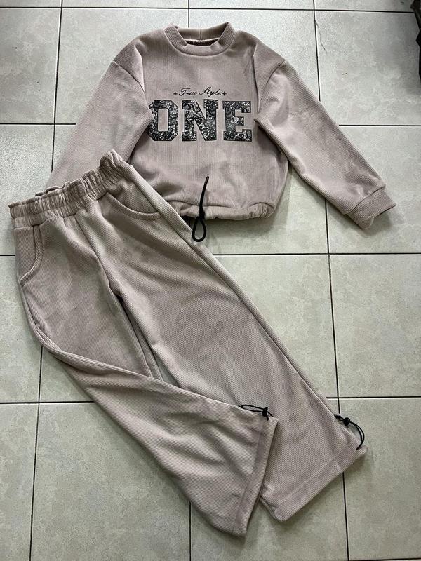 Стильний костюм Тканина: велюр рубчик утеплений Кишені в брючках. Брюки та кофта стягуються знизу кулісками. Повномірні!!! 128см. - 1шт 134см. - 1шт 140см. - 1шт 146см. - 1шт 152см. - 1шт Заміри: Рукав від горловини/довжина/ширина/довжина брюки/крок/бедра/пояс 128 - 54/46/43/77/55/36/27 134 - 57/47/44/8********** - 60/50/45/84/60/38/29 146 - 63/53/46/88/62/39/30 152 - 65/55/47/91/64/40/31 Мд