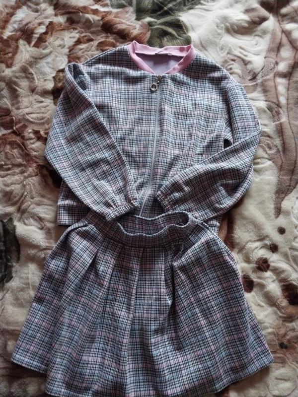 Очень красивый и качественный костюм для девочки. куртка бомбер и юбка рост 146 см куртка длина по спинке 48 рукав 43 пог 40 юбка длина 38