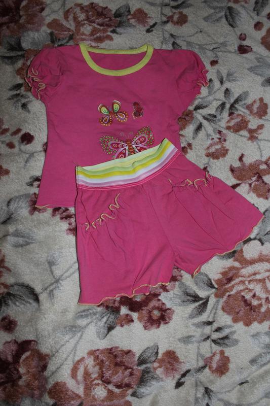 Костюм/комплект футболка і шорти. Приблизно на 2-3 роки Заміри: Ширина в плечах - 23 см Ширина між пахвами - 25 см Довжина - 31 см Ширина в поясі - 19 см, тягнеться 32 см Довжина шортів - 22 см