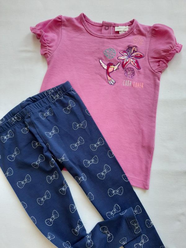 футболка рожевого кольору з нашивкою. матеріал: 50% бавовна ,50% бавовна Застібка: кнопки на спинці. пог 25,5 см довжина 35 см Лосини синього кольору, на еластичною гумці, принт -бантики матеріал: 96% бавовна, 4% еластан напівобхват по гумці 23,5 см довжина 45 см