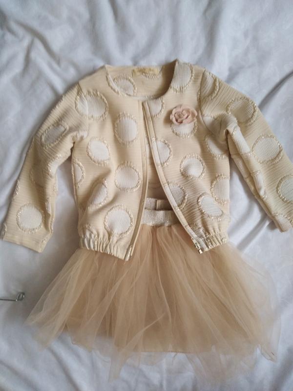 Костюмчик двійка, спідниця з фатином, дуже пишна кофточка на замочку, заколочка - квіточка знімається, по бажанню (можна і без неї). Заміри на фото. Кофточка прошита золотистою ниткою,блистить,дуже гарно виглядає на маленькій принцесі.