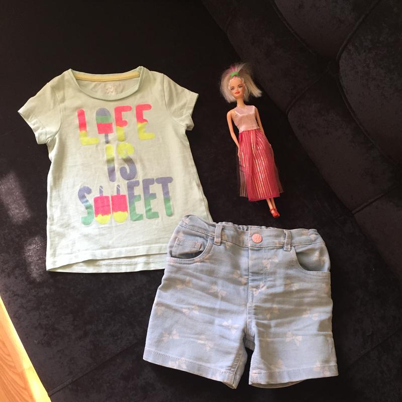 М'ятна футболка в яскравий принт f&f в ідеалі, заміри: пройма 26, плечі 20, довжина 36/38, Шорти джинс в бантики, пояс 27, стегна 33, довжина 25 на кнопці, кишеньки, утяжки