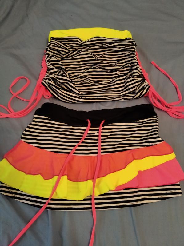 Яскравий костюм на дівчинку 8-10 років. шила сама на професійному обладнанні. Якість пошиття для себе. Розміри: груди - по жовтій резинці 30 см довжина топа-22 см в присобранном стані, можна розпускати мотузочку довжина спідниці-25 див. Що ще цікавить, звертайтеся.