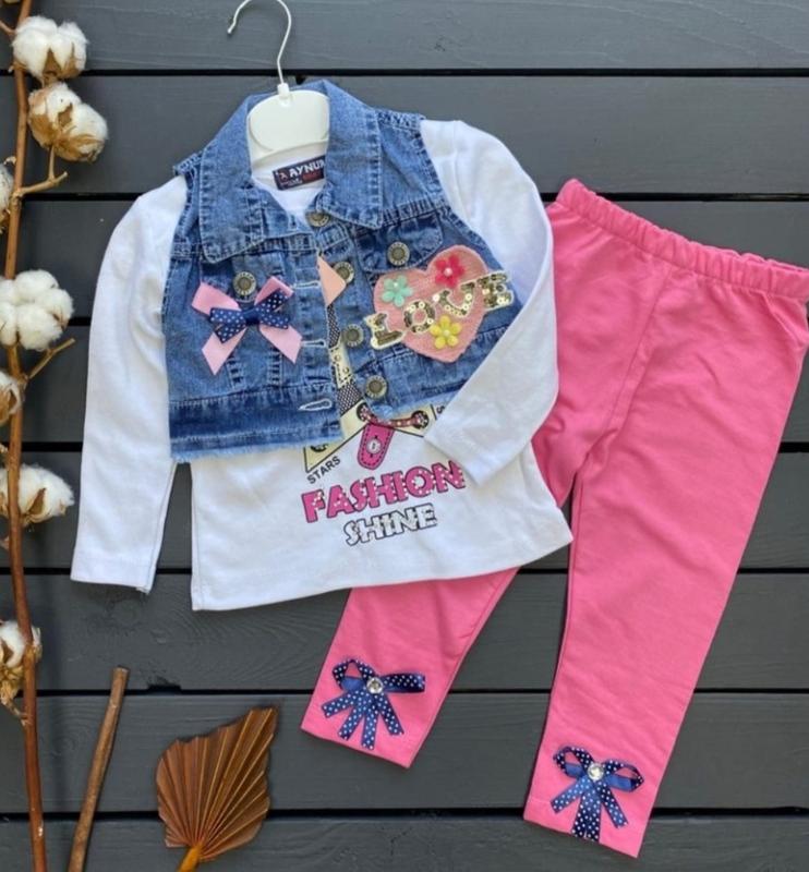 Перед такой красотой- не устоит ни одна модница! Костюм тройка про-ва Турция! Реглан – трикотаж Жилет – джинс с нашивками Лосины- двунить ✔ Размеры: 86 – жилет 22см, регл дл 33см, рук 30см, шт 45/28 92 – жилет 23, регл дл 34см, рук 32см, шт 48/31 98 – жилет 24см, регл дл 37см, рук дл 32см, шт 51/34 104 – жилет 25см, регл дл 39см, рук 35см, шт 54/34 ✔ Цена: 360