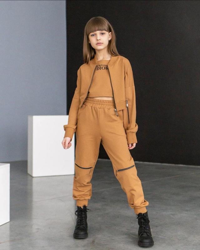 🤸♂️ Новинка 2021 Стильний костюм трійка - топ, бомбер і джогеры . Дуже стильний, прикрашений блискавками. тканина турецький трикотаж. Рекомендую!!! Заміри: Розмір-рукав/ довжина кофти; довжина топа/ширина; довжина штанів/крок/пояс 140 р - 58/35; 28/35; 79/60/27 146 р - 62/36; 30/37; 84/62/28 152 р - 65/38; 32/39; 87/63/29 158 р - 70/39; 34/41; 92/64/30