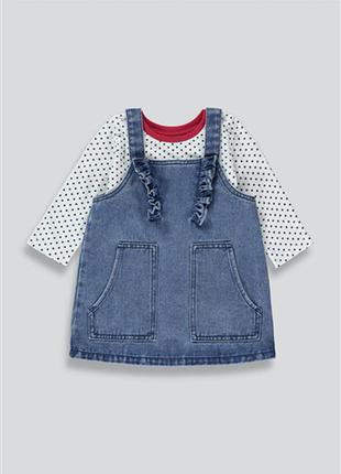 Набір для дівчинки MATALAN (джинс.сарафан + реглан) на 2-3 роки на р.92/98. Супермилий джинсовий сарафан з оборчастими бретельками та кишенями йде в комплекті з верхом у горошок із довгими рукавами. Склад. Верх: 100% бавовна. Сарафан: 100% бавовна.