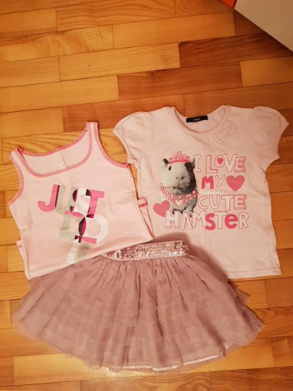 склад: трикотаж, бавовна маленькі дефекти на фото спідниця: ВІД 25(є гумка), дл.27 футболка: дл.39, ОГ 31 майка: дл.39, ОГ 30 можна як костюм або окремо