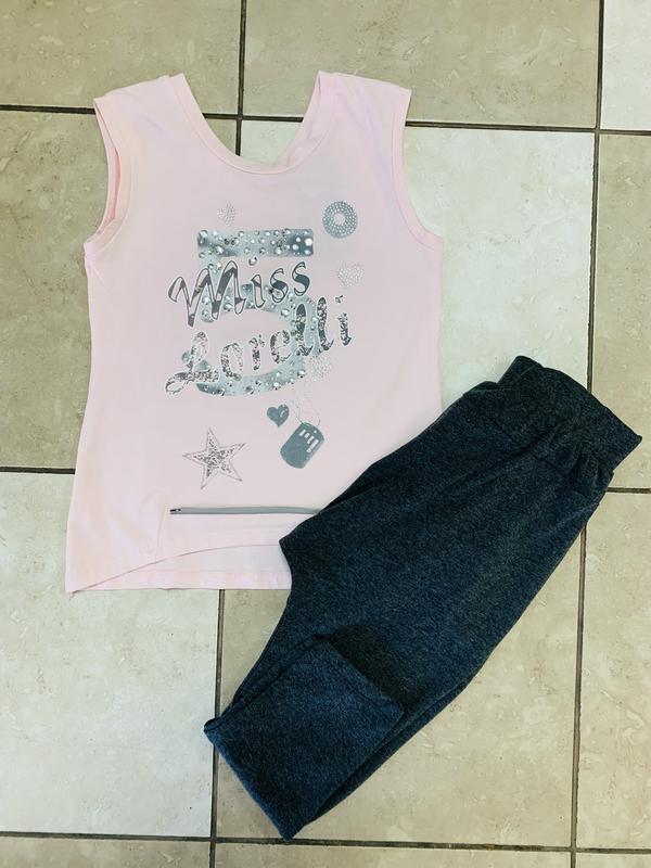 Костюм для дівчинки. Виробництво Туреччина. Заміри: розмір 134 - Майка - плечі 30 см, довжина 47 см, підлозі обхват грудей 32 см, бриджі - талія 62 см, довжина 62 см; розмір 140 - Майка - плечі 32 см, довжина 50 см, підлозі обхват грудей 33 см, бриджі - талія 62 см, довжина 66 см; розмір 146 - майка - плечі 33 см, довжина 51 см, підлозі обхват грудей 34 см, бриджі - талія 66 см, довжина 70 см; розмір 152 - Майка - плечі 33 см, довжина 53 см, підлозі обхват грудей 36 см, бриджі - талія 70 см, довжина 72 см