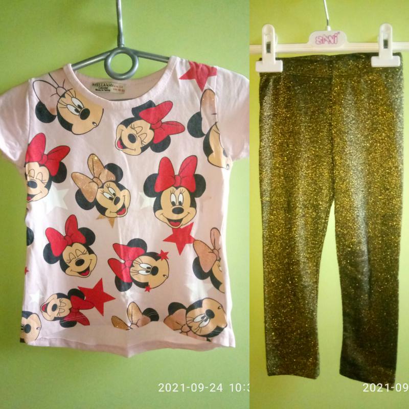 Лосины идеальные, на футболочке на некоторых мышках слезли блёстки после первой стирки (не критично, мы так и ходили). По бирке пишут 104 рост. Могу сделать замеры