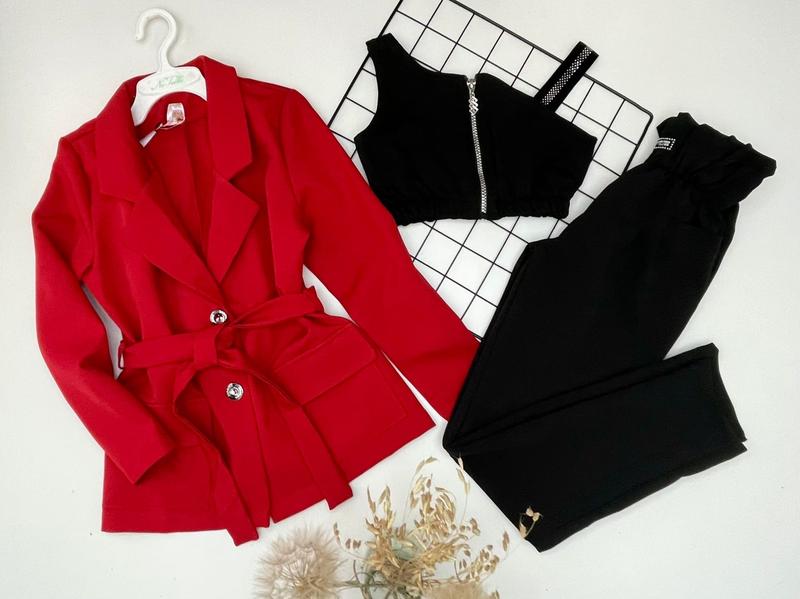 Стильная новинка Костюм тройка: стильный жакет+ топ+ стильные момы 🌳Ткань костюмка Армани Размеры/🌳дл.жакета/пог/рукав/🌳дл.топа/пог/🌳дл.штанов/шаг/пот/поб 128/🌳53/39/47/🌳25/30/🌳82/60/22/41-1шт _________________________________________.ирис