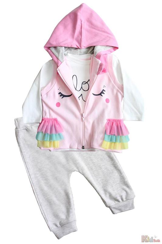 Приймаємо оплату карткою "Пакунок малюка". Гарний костюм 3-ка ніжно-рожевого кольору для дівчинки. Комплект складається з: - жилетки з капюшоном на блискавці, прикрашена рюшами ; - реглан з принтом , на лівому плечі застібається на дві кнопочки; -штани на гумці з манжетами внизу. У даній моделі дівчинка буде виглядати модно.