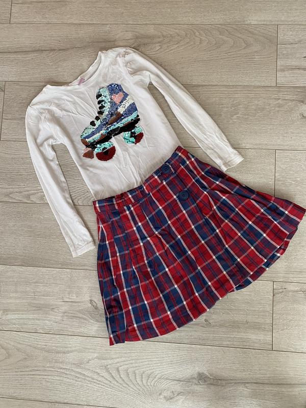Фото на тілі немає Набір комбінований,можна носити окремо Спідниця в клітку застібається на гудзики на запах Є гумка і гумка для регулювання розміру середня Щільність не тягуча Кофта з малюнком в паєтках Кофта не ідеальна з плямами (непомітні) На фото видно Виміри спідниці 34 см, Пот 28 см) Побіди 42 см) Знизу 74 см) Заміри кофти Довжина 44 см) Плечі 30 см) Рукав 42,5 см) Пог 37 см) Піт 34 см, Знизу 38 см) Підійде на 5-7 років орієнтуйтеся по замірах