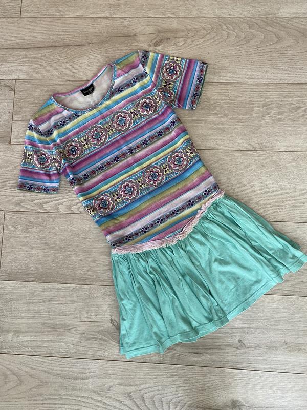 Фото на тілі немає Набір комбінований,можна носити окремо На талії резинка Тягуча Не щільна Майка з короткими рукавами Тягуча Не щільна Знизу невеликим клинцом з рюшами в стилі бохо Заміри Довжина спідниці 31,7 см) Піт 26,5 см) Побіди 33 см) Знизу 75 см) Виміри Майки Довжина 40-45 см) Плечі 31,5 см) Рукав 17 см) Пог 37,5 см) Піт 36 см) Знизу 37 см) Підійде на 5-7 років орієнтуйтеся по замірах З нюансів-є микрокатышки на фото видно