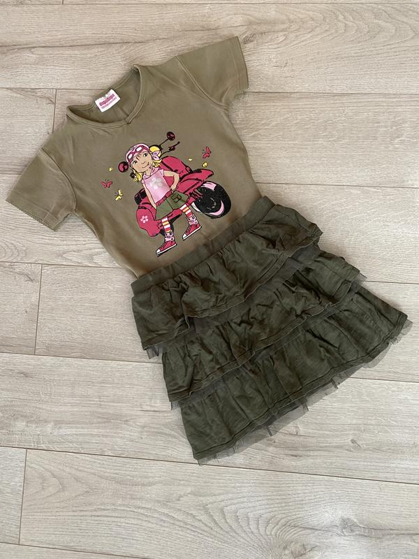 Набір комбінований Можна носити окремо Тягучий середня Щільність На майці малюнок (дівчинка) Рукави короткі знизу і на рукавах невеликі рюшки На спідниці на талії резинка Спідниця з рюшами знизу фатін Актуальний колір Сліди шкарпетки незначні Виміри Майки Довжина 42 см) Плечі 30,5 см) Рукав 11 см) Пог 33,5 см) Піт 31,5 см) Знизу 39 см) Виміри спідниці 32,5 см) Піт 29 см) Побіди 38 см) Знизу 50 см) Підійде на 5-8 років орієнтуйтеся по замірах