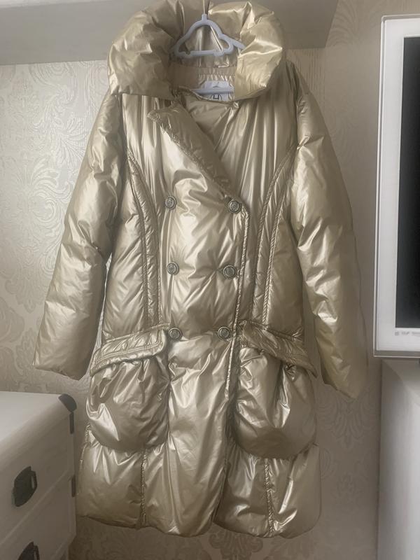 Гарний теплий пуховик Silvian Heach золотистого кольору для дівчинки 12 років. Виконаний двобортним пальто. Тканина водовідштовхувальна. Стан самого пуховика відмінне. Є хутро відстібається, який ми в шкарпетці не використовували, хутро нерівномірно фарбують (показала на фото), можливо, так і було задумано) Дочка носила з снудом, виглядає більш стильно. В іншому все ідеально. Склад на фото. Виміри за запитом. Обмін і повернення не передбачено.
