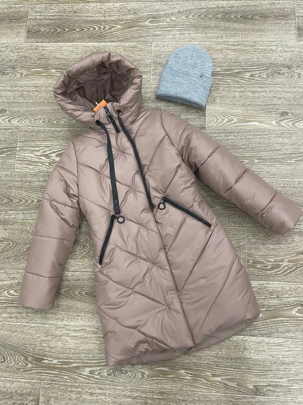 Шапка у подарунок 🎁 ‼️(шапка зимова подвійна вʼязка) Розмір: 140 146 152 158 Колір: бежевий Матеріал: Водовідштовхувальна Плащова тканина. Підкладка: Memory oil Склад: 90% Nylon; 10% Polyamide Тип застібки: Блискавка, кнопка. Утеплювач: Синтепух щільністю 250г/м2 Подовжена зимова курточка для дівчаток. Модель прямого крою з капюшоном-коміром на блискавці. На капюшоні шнурки, що регулюються, для збереження тепла всередині куртки. рукави всередині із трикотажною манжетою використовуються для збереження тепла, захисту від вітру та попадання вологи. Зовнішні кишені на блискавці з невеликими підвісами.