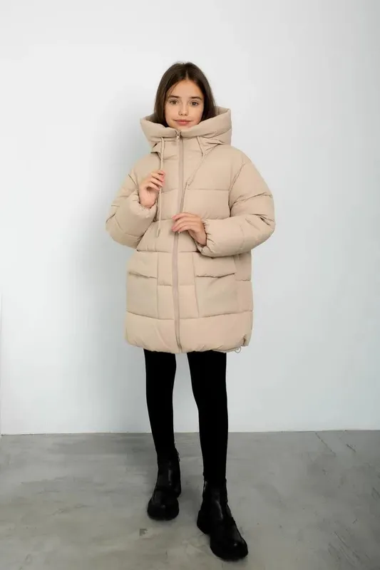 Стильна зимова куртка для дівчаток, яка забезпечить тепло та комфорт в холодну пору року. Силует і крій: Куртка вільного, прямого крою з подовженою довжиною, що дозволяє захистити дитину від холоду. Капюшон та високий комір додатково захищають від вітру та снігу. Матеріал: Верх куртки виготовлений з водонепроникної тканини, яка не пропускає вологу та вітер. Внутрішнє утеплення надійно захищає від морозу та створює затишок. Деталі: Куртка має зручні глибокі кишені для зберігання необхідних речей. Закривається на блискавку та кнопки, що додає надійності. Функціональність: Ідеально підходить для щоденного використання в зимовий період. Куртка поєднує стильний вигляд та високу функціональність, що робить її відмінним вибором для активного відпочинку та прогулянок.