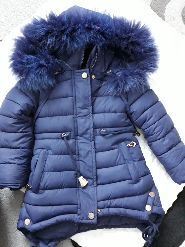 Дитячий пуховик синього кольору. На бірці пише, що для дитини 4-х років. Підійде на 3/4 рокі для худенької дівчинки. Замок і гудзики робочі.