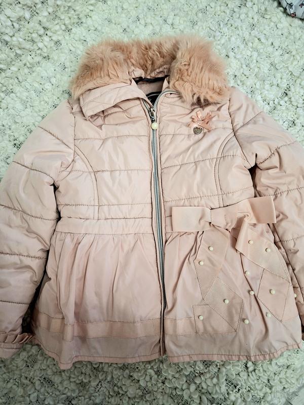 Дуже тепла зимова куртка на дівчинку, колір рожево- персиковий, внутрішній підклад хутро, хутровий комір знімається, підійде на дитину 3-5 років.