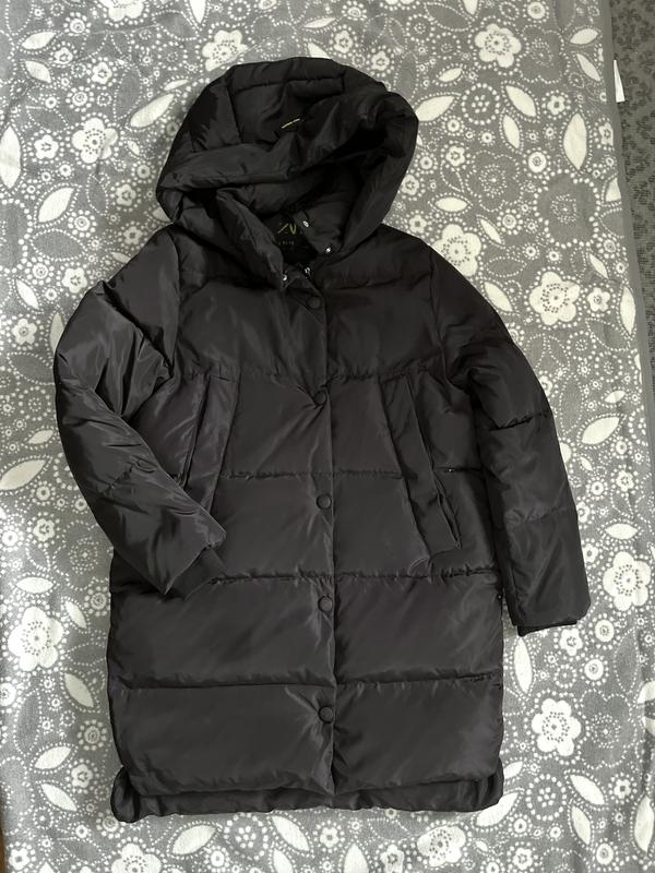 Тепленький пуховик ZARA на дівчинку 13-14 років зріст 164 см, заміри на фото, з натуральним наповнювачем (50% пух, 50% - перо), з манжетами на рукавах і капюшоном, ззаду трошки довший. Має невеликий нюанс - кілька плямок, які видно під деяким кутом (на останньому фото)