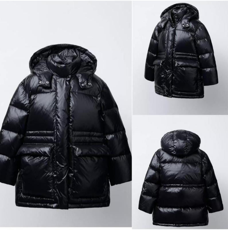 В наявності НОВИНА колекція, куртка-пуховик Зара (оригінал, викуплений в Німеччині). Розмір 12/13р (156 см). Заміри: довжина 72 см, ширина під пахвами 54 см (є утяжка по талії всередині курточки), рукав від капюшона 70 см, по внутрішньому шву рукава 45 см. Колір чорний. Наповнювач 50% пера та 50% пуху. З капюшоном, високим коміром на кнопках. Застібка на блискавку, приховану планкою, та кнопки спереду, накладні кишені з клапанами.