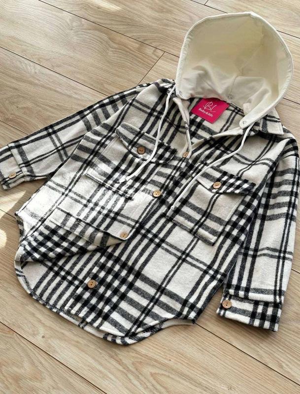 Супер стильна сорочка з капюшоном! Сорочка подовжена, застібається на гудзики. Є накладні кармани. Капюшон знімається (на гудзиках). У капюшоні є утяжка-шнурок. Тканина - турецька байка. Супер якість! Заміри: 140 - довжина - 63см, напівобхват грудей - 47см, рукав від горловини - 58см. Мс