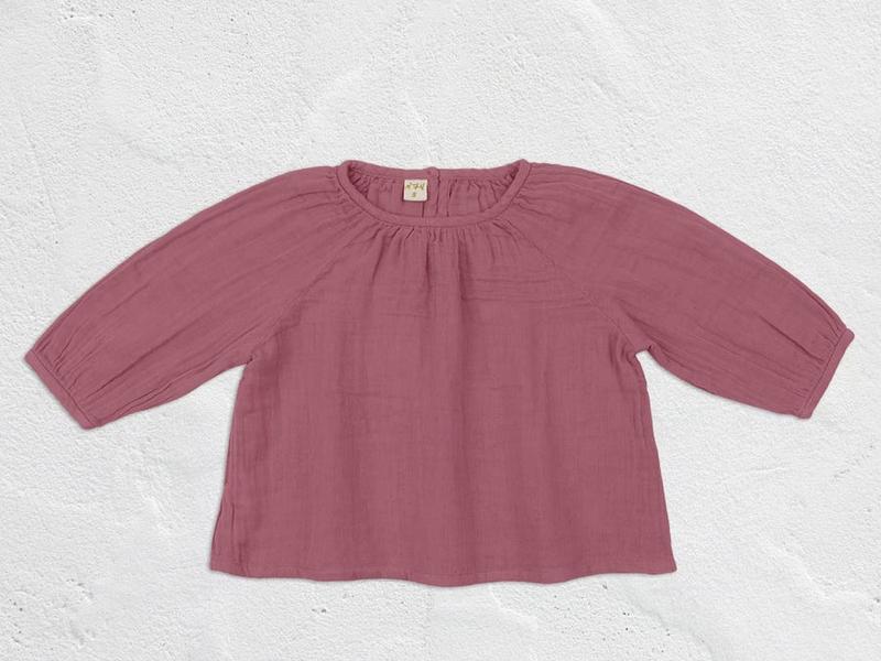 Розкльошена блузка з довгим рукавом, круглим вирізом і еластичними зап’ястями. Виріз спинки з перламутровим ґудзиком. Матеріал/склад: подвійна марля, бавовна, 100% органічна бавовна, сертифікована GOTS. Ручна робота майстрами з Таїланду. Потенційні незначні варіації форми, кольору та розміру слід розглядати як природні особливості процесу виробництва ручної роботи.